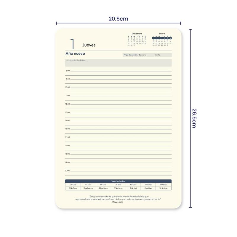 Organiza tus días con la agenda Júpiter Azul Marino KP, una herramienta que equilibra elegancia, funcionalidad y sostenibilidad. Con 400 páginas en formato diario, papel crema de 60 g/m² y frases motivacionales, es ideal para planificar con estilo. Sus bordes dorados y tapas de biocuero reflejan lujo y durabilidad. Además, comprometidos con el medio ambiente, contribuimos al manejo forestal responsable y contamos con las certificaciones FSC A000511, ISO 9001:2015 e ISO 14001:2015. Incluye planeadores mensuales y anuales, perfectos para gestionar tu vida profesional y personal. ¡Haz cada día memorable con esta agenda diseñada para el éxito! Hazlo fácil, hazlo rápido, hazlo tuyo.