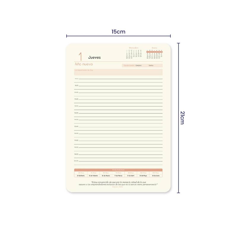 La agenda Venus Jade Pastel KP es la herramienta ideal para equilibrar tu vida personal y profesional con estilo y funcionalidad. Diseñada en formato diario bilingüe (español e inglés), cuenta con 400 páginas de papel crema de 60 g/m² con frases motivadoras que inspiran cada día. Sus tapas de biocuero italiano y acabados pespunteados garantizan elegancia y durabilidad. Además, comprometidos con el medio ambiente, apoyamos el manejo forestal responsable y contamos con las certificaciones FSC A000511, ISO 9001:2015 e ISO 14001:2015. Incluye cinta separadora de seda y encuadernación tipo libro, perfecta para quienes valoran la calidad y la sostenibilidad. ¡Transforma tu organización con Venus KP! Hazlo fácil, hazlo rápido, hazlo tuyo.