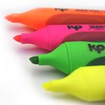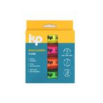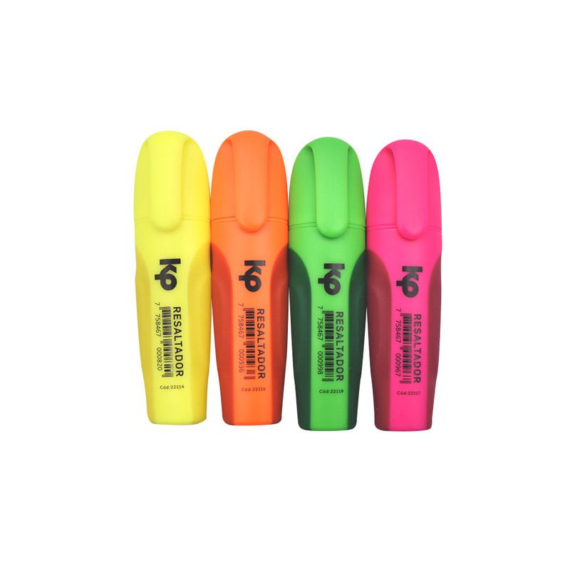 Set de 4 resaltadores KP con colores intensos y punta biselada para subrayar con precisión. Ideales para resúmenes, apuntes y estudio diario. Su tinta es de secado rápido y no traspasa el papel. Diseño ergonómico que brinda comodidad en el uso prolongado. Perfectos para escolares, universitarios y profesionales.